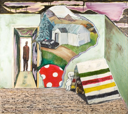 Consequently, while painting this piece it was important for me to bare in mind a sense of non-reality (as opposed to fiction) that would reflect the moment that I had no way of experiencing aside my imagination. A child playing or maybe hiding. An imaginary friend or possibly a friendly ghost keeps her company in the lonely cabin while a man, possibly the Pied Piper or simply just a man, stands at the the cabin door in the moment right before the unknowing child is abducted into civilization. Disjointed and abstracted perspectives suggest the impossibility of my re-imagined moment, yet a sinister mood creeps across the surface, unifying the plains.