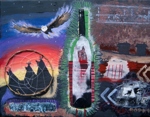 When I set out to create a piece for this contest I wanted to explore a theme that was relevant and personal. I believed that my piece would have the most meaning if I was dealing with a topic that I was able to relate to. I wanted to work with what I knew. I chose a theme and not a moment in aboriginal history because I felt that the theme of alcohol abuse and the struggle with addiction for first nations people was a stronger base for inspiration. I wanted to explore abuse in my piece, specifically alcohol abuse, because I believe that it is a hugely detrimental factor in the lives of many aboriginal people. I think it is important to be able to have a dialogue on such a sensitive issue, and I wanted my piece to help accomplish that. I chose to juxtapose two very different aspects of first nations culture. I was heavily influenced in my piece by Jane Ash Poitras, an artist whose work I really admire. I chose to emulate her style because I felt that it was the most effective medium to connect to my chosen theme. The upper third of the work draws heavily on the metaphor of finding the way. In the left side, the stars act as guidance and light, and in the right side, the sky is murky and the only light in the sky is the word lost, written in the style of learning english letters. The dream catchers in my piece, both the whole and the shattered one, represent another important aspect of first nations culture. On the left, the dream catcher is whole and strong, it represents unity and safety, while on the right the dream catcher has been shattered and broken, it lies in pieces. My piece is meant to show the passing of time, the bottle in the middle is a distorting factor, it has made the path become lost, just as alcohol and substance abuse has for many first nations communities. The overall message that I am trying to communicate through my piece is my feelings towards alcohol abuse and the effect that it has had on my people.