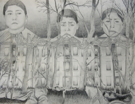 “In Memory of My Grandfather” is a work of personal healing, a tribute to my ancestors, and a means of empowerment and reconciliation for Indigenous peoples and Nations by sharing our ‘truth’ surrounding the legacy of the Residential School System. This piece is a depiction of two layered images; a photograph of three boys who attended a residential school juxtaposed with an image of what was Garnier Residential School in Spanish, Ontario. This was the institution my Grandfather was forced to attend in accordance with Federal Indian Policy (note: the boys in the drawing did not attend Garnier Residential School). The three children in this piece display steadfast emotion, as they stand strong in the face of cultural genocide. The children’s positioning against the facade of the institution contrasts the historical damage, displaying their strength and courage in the face of adversity.
