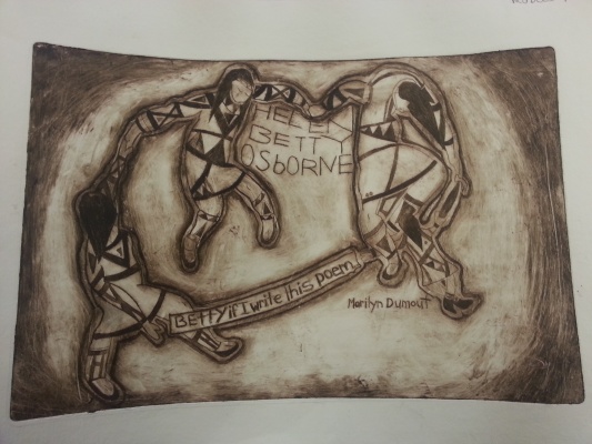 I’ve always been inspired by my aboriginal culture and always express though art. A recent art project that I was introduced to in school was to do a book cover or a poem of interest. Since I’m aboriginal and really take my culture as a gift I picked the poem from the book by Marilyn Dumont. I was really excited to read this book of poems. As I was reading I came across several interesting poems, but the one that popped out to me the most was a poem that was called Helen Betty Osborne, it was about an aboriginal that was raped and stabbed many years back. The poem just states the overwhelming events us natives go through on a daily basis. I was inspired by the poem and created my art piece that really brings out the true meaning of how I truly felt while reading this poem. I hope you can see my art piece as a remembrance rather than a poem itself.