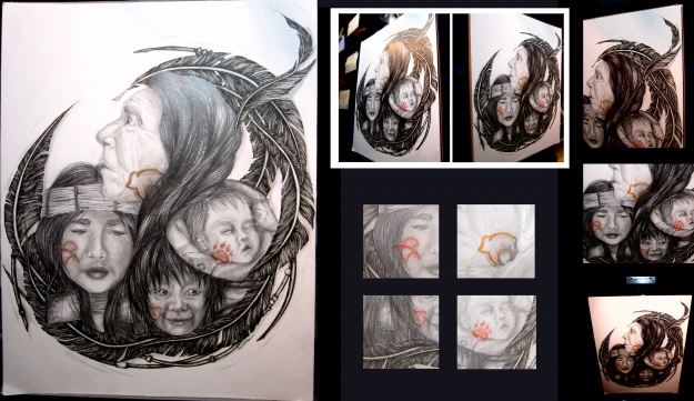 I illustrated this by referring myself to the Native Circle. I drew an elder (North), an adult (West), a youth (South) and a baby (East). I put an equal amount of both sexes in order to keep them equal and to show that they both hold importance. I made the elder look up as though he sees something we can’t, to represent the spiritual quarter. The woman is looking down caringly and almost in thought, at the child because she is to teach the youth the ways of life and her quarter of the circle represents mentality. Next, the youth has a smile to show its energy and physique and then the baby is sleeping; this makes us relax which is to represent the affective quarter. I then incorporated the symbols of each animal in the correct quarters: the bear, the wolf (a paw), the turtle and the eagle.