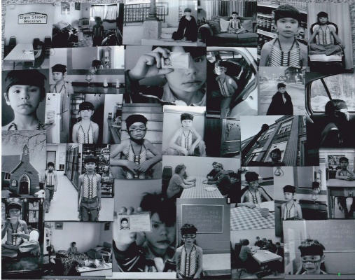My model is my 7 year old brother Phoenix. I made an outfit for him based on the stereotypical Hollywood version of a Native person. I made everything he is wearing. We went around our city of Sudbury and I took photos of him in non-traditional places, no rivers, no lakes, no Mother Nature. Just him in and around the city, in places like the grocery store, back of a police car, soup kitchen, church, rectory, and school. These places have had a direct impact on our Native culture.