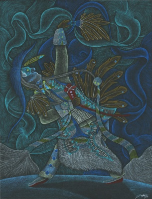 As illustrated, the Traditional Dancer is cleansing the earth with his tool; the Eagle Fan, which is used as a healing tool in many Aboriginal cultures. The regalia he wears represents the winter season and how cold and sharp it can be, but yet still be beautiful and elegant. With winter being a frigid season his Staff is what guides him through it.