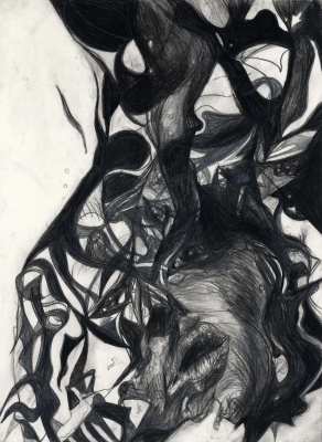 My work explores flux and transformation. The transformation from one material to another, one being to another, one state to another, one moment in time to the next. In my drawings bodies become diaphanous and shatter into pieces. One thing easily slips into another, evading concrete definition. Nothing is pinned down, ambiguity and disorientation reign. The image comes apart and reforms in front of your eyes. It’s like the moment in the darkroom right before the developer sharpens the photograph into focus. Space or ether, what nobel-prize winning physicist Franz Wilczek calls “The Grid”, becomes activated, pulsing with spontaneous activity that creates and destroys.