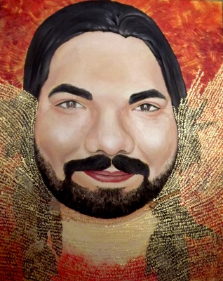 I have surrounded his image with 79 distinct conversational phrases in Cayuga, one for each remaining fluent speaker. After conducting considerable research on Cayuga, I handpicked these phrases and painted them i gold to reflect an optimistic view of the language and its future. Although the flow of these phrases may appear choppy, they stand as a kind of poem which represents the state of the language as currently exists: fragmented and clumsy, yet beautiful and harboring great potential.