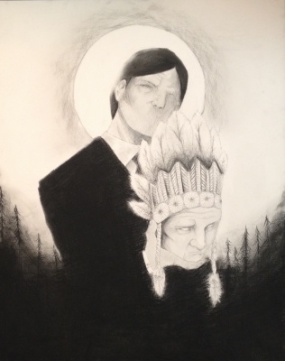 The medium I chose to work with were charcoal and india ink, for I felt they would give a harsh feeling within the piece. I decided to make the piece a greyscale for the lack of colour in his own world. He shadows over the eerie forest, but his new self it guided by the new found god pushed onto him.