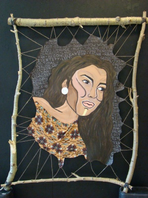 I chose to create a piece that displays aboriginal “identity.” The reason I put identity in quotations is because it is not the true identity of all aboriginal people, but what some have become and how many people in society view them. My piece is meant to share the dark legacies that the residential schools have left behind. My work includes many words that indigenous peoples have been stereotyped/labeled, including some key elements that society as a whole has constructed. The portrait of the girl is me; I am not familiar with my aboriginal culture as much as l would like, having been raised in the white western culture I do feel the disconnect. However, underneath my white skin there is First Nations blood from the tribe Miawpukek that runs through me and holds my history, my story. In society I am considered, treated and viewed as a white Caucasian with a small percentage of aboriginal and because of that I have been called “pretend Indian,” however I am a confident, competent and intelligent female full status Aboriginal.