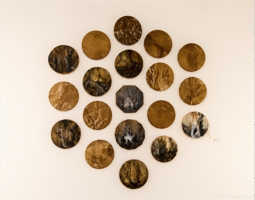 Resonance is a painting installation representing the importance of intergenerational learning.  I have worked with my father and Master Drummakers to learn drummaking and the ceremonial significance.  The drums have all been handmade by my father and I, with images painted on the face.  The images depicted show aspects of cultural importance, such as sweat lodges, buffalo hunts and sweet grass.  I have intentionally left certain drums blank.  This is done to bring awareness to the ceremonies, languages and customs that have all been lost due to the cultural genocide that aboriginal people have experienced as a result of Residential schools, disease and Indian Acts to list a few.  This has inhibited intergenerational learning and passing of knowledge to future generations.