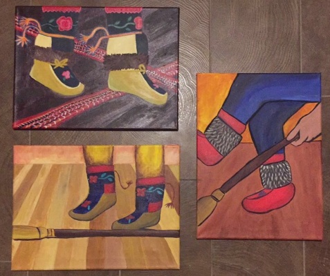 This triptych was inspired by my community, my family, and my grandpa's mukluks. Having started to attend Jigging Nights every Friday within the last year, and seeing my friends and family dancing around me, I was inspired to create paintings based off of my experiences. As weeks would pass and different people would come and go, I began to generate basic ideas of what I wanted to make, based off of the array of moccasins and mukluks. However it wasn't until my brother attended one of those nights, wearing my grandpas mukluks, and doing the Sash Dance, that I realized exactly what I wanted my content to be. I took as many pictures as I could of my friends and family dancing, and over the next couple of months my paintings evolved and grew into the solitary piece it is today.