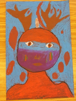 I drew deer antlers because I like to hunt and eat deer. War paint reminds me of grandpa because he used to wear war paint. I used red because I really like the colour red. It makes me feel happy and powerful.