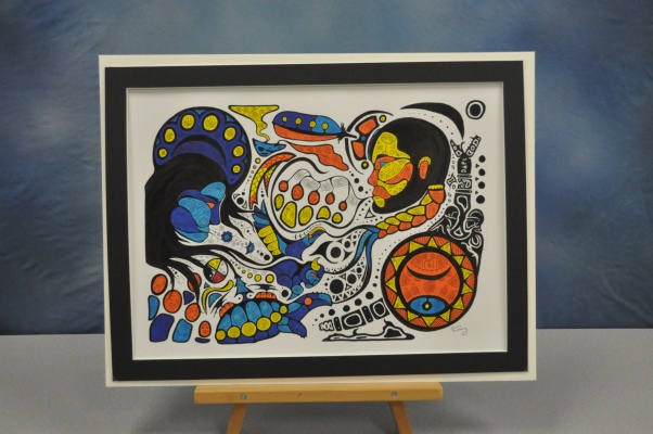 This piece that I have created represents my leadership through my culture and teachings. My heart and mind is driven by my willingness to bring my people forward in any way I can, whether it’s through my artwork, my words or my actions. There is an Anishinaabe Prophecy, the Seven Fires Prophecy. Each fire represents an important point in my people’s past, present and future. The seventh fire describes the movement of our youth today; it talked about how the youth of the indigenous people will retrace their steps and return to the original teachings, and bring healing to the world. The left side of this artwork in blue represents our past and the teachings that are found in our history as Anishinaabe and Onyota’aka. These teachings we look to today as they guide us towards the future in a healthy way. The eagle, the buffalo and the turtle all hold a great significance in our culture. On the turtle's shell rests the Lodge of the Anishinaabe and the Longhouse of the Haudenosaunee, this represents the historic relationship between the two. The three animals are connected to the three strands that make my braid. As indigenous men our long hair connects us to the earth and our culture. Our hair is sacred, the three strands that make up my braid is made with the balance I need in my daily life. In front of my face just above the center, are the youth. Our youth are our future, and it is important that we guide them in a way that ensures the betterment of our people. Through our culture we find purpose, and unfortunately for our youth the realization of purpose is not always abundant. Without purpose a child can find themselves lost, and can be susceptible to turning towards the wrong path. A path of drugs, alcohol and violence; our communities are troubled with these things along with high suicide rates. On the far left I included the DAPL protest. There are hundreds of examples of oppression and conflict besides the DAPL conflict, and the strength my people have shown through coming together during times like this represents the rise of the seventh fire in the 7 Fires Prophecy. Our strength has grown, but the pride within our people has never left. We are resilient and proud. Yaw^ko, miigwech.