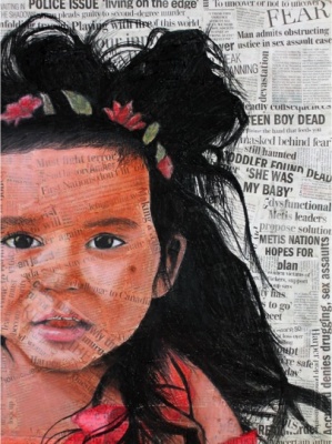 An epidemic hidden amidst the whirlwind of news outlets and uninformed consumers of media conceals a dirty secret. Our women are vanishing and no one is taking notice. The Indigenous community is suffering from a plague that is affecting thousands of Aboriginal girls and women across Canada each year. The homicide rate remains significantly higher for those of an Indigenous background than all other women in Canada. The voice of our people has always been rooted in our artwork and remains as a fundamental influence to reflect our stories. Newspaper clippings are scattered across the background as a reminder of the violence inflicted upon the Indigenous communities and what may be left forgotten. The girl in this piece is not chosen at random either. This portrait of my cousin is a sharp reminder that the struggle of murdered and missing Aboriginal women is not a distant conflict, but rather a battle that hits close to home. My cousin is a symbol of hope for the past, present and the future of Indigenous women. In times of struggle, we have proven to remain whole and create a network of support for one another. We are not forgotten and we are not broken. We are the sheer representation of hope.