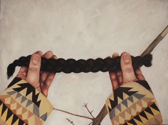 With long hair being significant in Indigenous culture and representative of tradition, I wanted to show a braid being cut. The cut braid symbolizes the loss of a life and loss of tradition. Cutting of the hair is also an indication of the of Residential schools where children would have their hair cut as an act of assimilation, to lose their culture. The hands holding the braid is a sign of remembrance to the lost life and holding onto the culture.