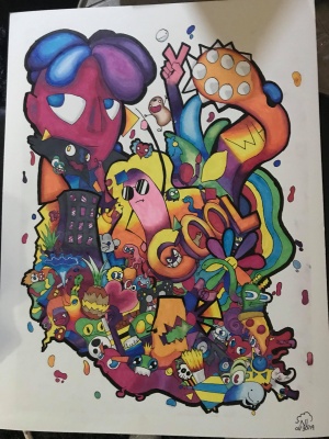 A series of multi-colored shapes and characters burst from the bottom right of the piece, and burst out into larger characters, shapes, props, etc.