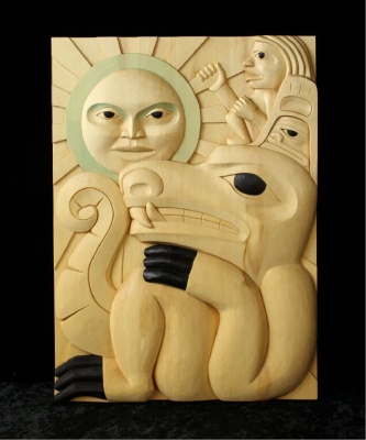 This piece is carved on a laminated panel that I created in the summer of 2018 from raw boards of yellow cedar. I sourced this material 5kms up the highway from my residence in Terrace, BC. I machined and fitted these pieces and joined them together with glue and clamps. I then designed this panel as a 2D drawing and traced it on, then gradually removed layers of cedar to create different depths using gouges, chisels, and traditional Adze's. After creating the different depths I worked to create shape and expression in the figures. This is all hand carved and knife finished. Knife finishing is creating a finished smooth surface without the use of sand paper. It takes a great deal of time to complete and was done using traditional bent knifes I created myself.