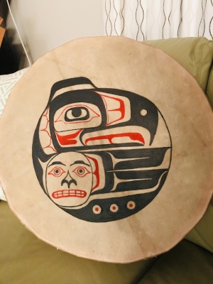 My mom got an elk drum from our matriarch two years ago, when we joined an all-ages Tsimshian dance group in Vancouver. Mom didn't know what to paint on it. She said to me that she wanted to paint an eagle for our clan, the Royal House of Legaic symbol for our family heritage, and three things to show her three children. She helped me find out what our people draw as Tsimpshian. She showed me how to make a picture, and then to pencil transfer it to the drum. She told me that we only paint in three colours: black, red and turquoise. This was very hard to do, but I worked really hard. I had to use nail polish remover when I made a mistake. Sometimes I got frustrated, and sometimes it was easy. In the end, my mom was so happy, and it made her proud of me. We use our drums in the dances and cultural shares, and I am happy that she likes her drum.