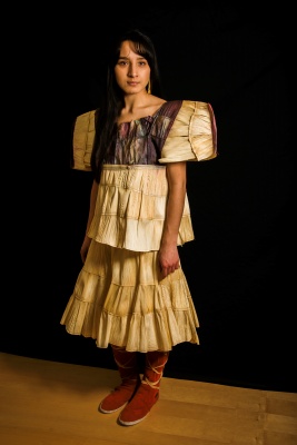 The work jee kéé is inspired by the revitalization of the Ndé traditional corn maiden dance. The style of the dress is based on the traditional regalia of my people, the Lipan Apache Band of Texas. I am interested in revitalizing methods of growing traditional food, therefore, in this work, I have used corn husks from the corn my family grew and harvested last season. The corn seed itself has been passed down within my family for many years, going back as far as my great grandfather, and is traditionally grown in our territory.